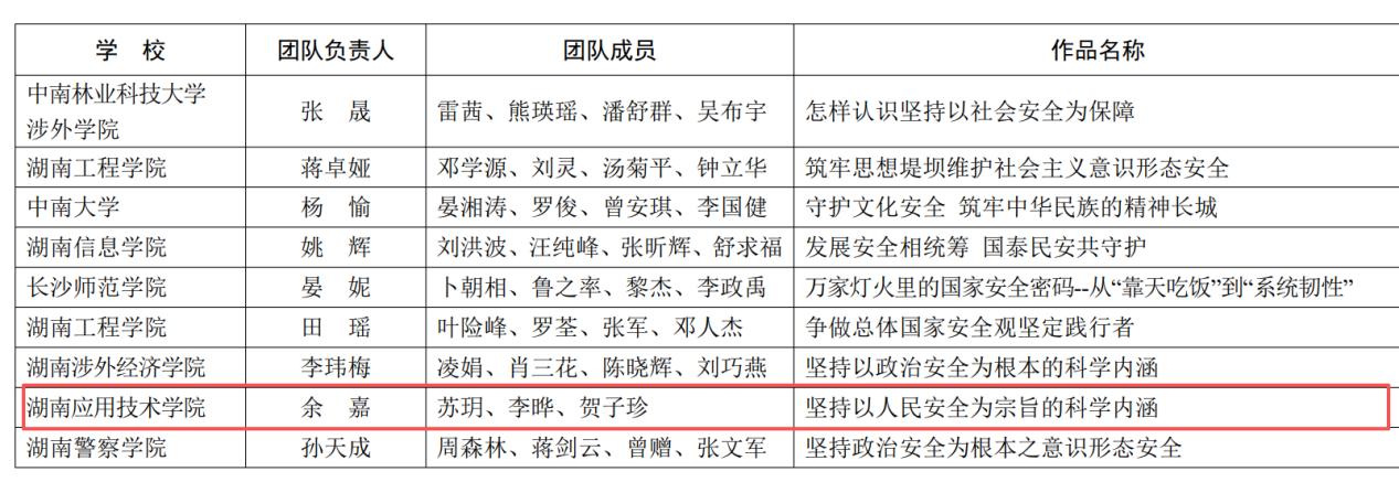 (通讯员:贺子珍)热烈祝贺我校马克思主义学院余嘉老师,国家安全教师团队在“湖南省高校国家安全教育课程教学展示活动”中斩获二等奖!